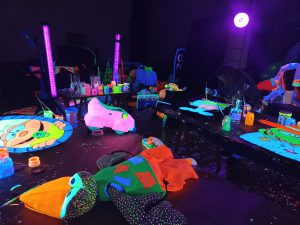 Elegimos la técnica de la Luz Negra por su calidad estética y porque es el lenguaje visual que mejor refleja la magia que buscábamos sobre el escenario, y el formato de “Musicales de grandes marionetas y actores en luz negra” porque la música y las canciones son un excelente vehículo para ayudar a transmitir las emociones de los personajes, envolviendo la palabra.